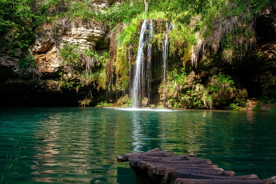 The waterfall flows into a small lake filled with blue water.